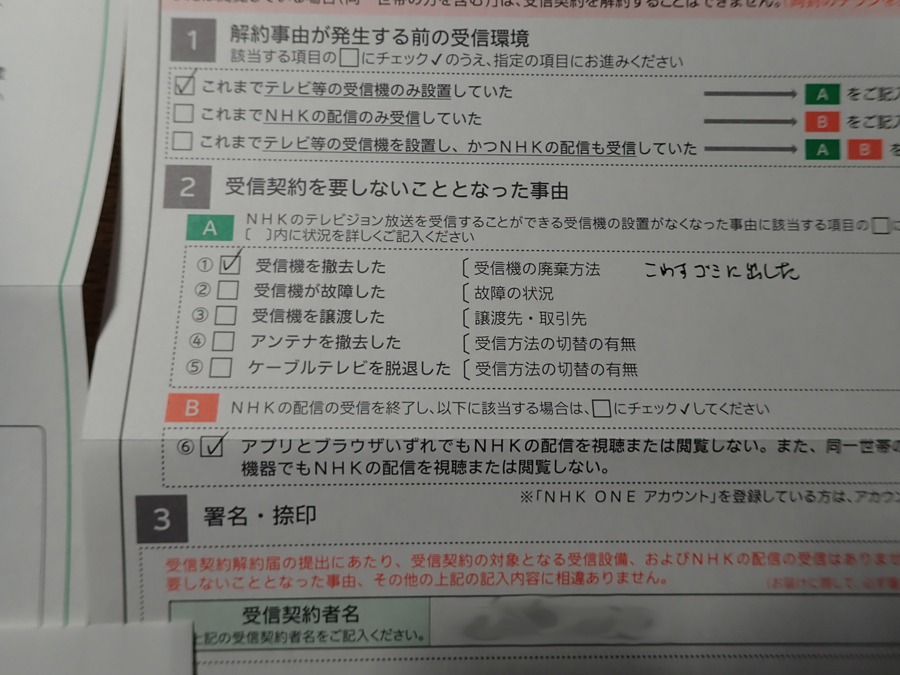書類が送られてくるまで1週間かかるのは、地域スタッフがチェックに来るためかもしれない。アンテナ撤去ならアンテナを見に来るだろうし、受信機撤去の場合は、クルマのフロントガラスに貼られたフィルムアンテナを見に来るかもしれない。